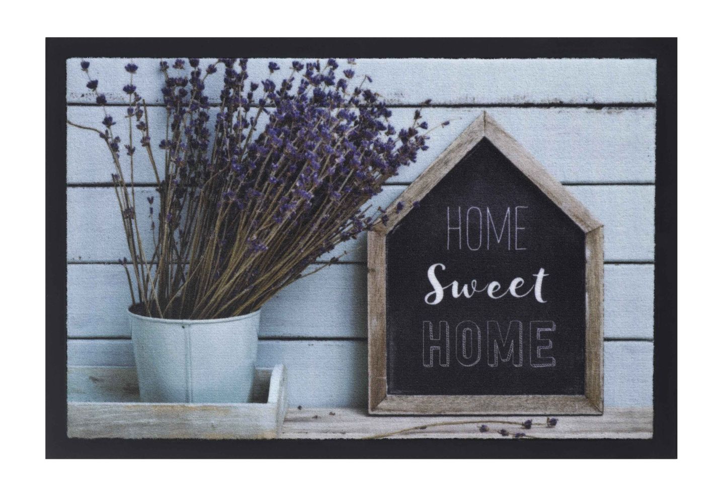 Tapis personnalisé fabriqué avec des fibres de polyamide pour absorber la saleté et l'humidité, au visuel d'entrée lavande orné de l'inscription Home Sweet Home, fonctionnel et décoratif.